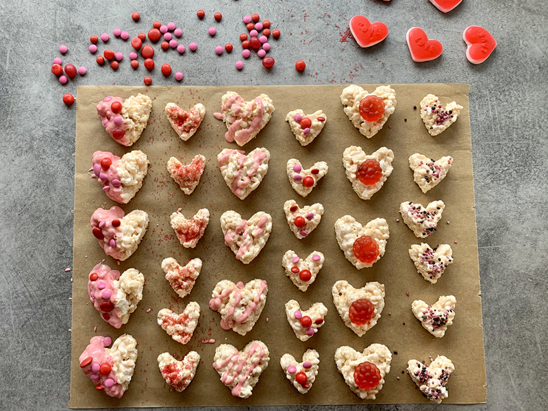 Smør og skúmgæti verður smeltað í eini grýtu, inntil alt er samanhangandi, kleprut deiggj. Rice Krispies verður rørt í grýtuna. Ein bakiformur ella eitt fat verður smurt við smøri, og deiggið verður stoyt í. Bakiformurin verður settur í køliskápið í eini 20 minuttir, ella inntil tað er harðna nakað. Hjørtu verða skorin út við hjartakøkuformum. Vit prýddu okkara hjørtu við reyðum og ljósareyðum bommum og krymmel. Eg blandaði nakað av reyðari fruktfarvu í smeltaða hvíta sjókulátu, og so vórðu nøkur hjørtu dyppað í eina skál við sjókulátuni.