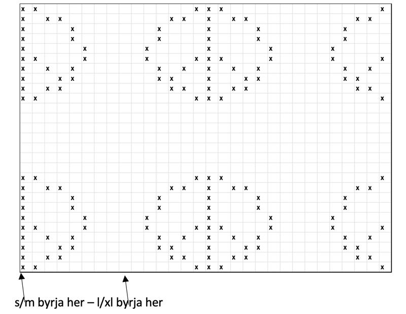 Bint 10 umfør rond, 2 rætt, 2 rangt. Bint 1 umfar, og tak javnt uppá til tað eru 45 eygu á ermuni. Bint 3 (5) umfør við gulum, Bint nú eftir mynstri til erman er umleið 42 – 45 cm. Læs av.
