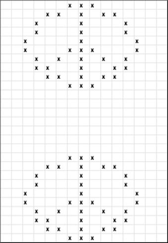 Bint 10 umfør rond, 2 rætt, 2 rangt. Bint 5 (7) umfør rætt við gulum. Set merki í hvørja síðu, soleiðis at tað eru 60 (75) eygu á hvørjumegin. Halt fram eftir mynstri inntil bulurin er umleið 38 (40) cm.