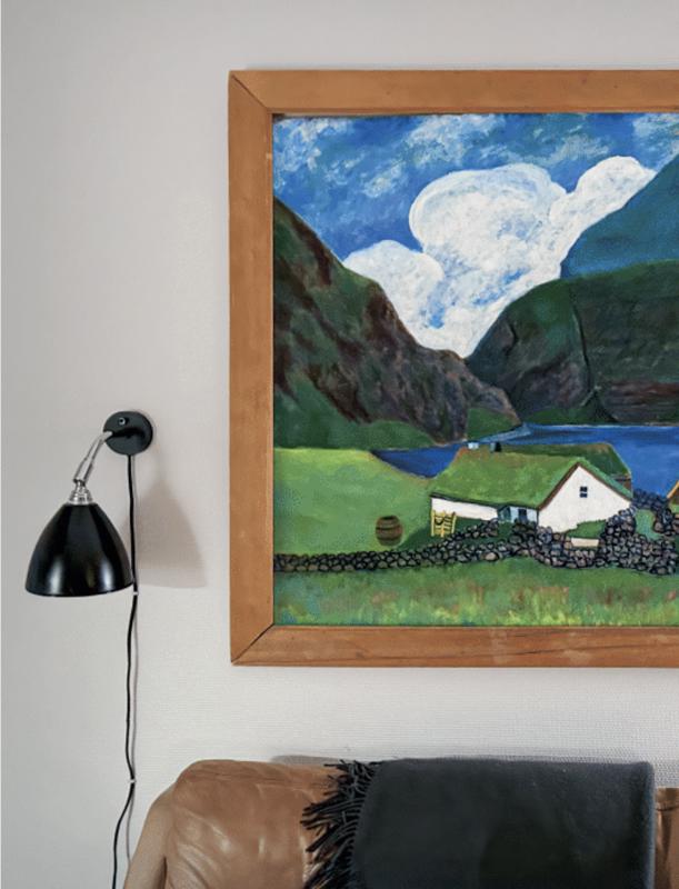 Eg flutti heim til Føroya áðrenn maðurin, og eftirsum einki flytigóðs var komið heim, keypti eg eina nýggja sofu. Eina viku eftir, at sofan var komin í stovuna at standa, fekk eg bjóðað ein fantastiskan málning av Saksun hjá Frimodi Joensen. Prísurin var júst tann sami, sum eg hevði goldið fyri sofuna. Eg ringdi tí til handilsmannin og spurdi, um eg kundi koma aftur við sofuni, tí hon riggaði ikki ordiliga í stovuni. Tað var gamaní, og eg keypti málningin í staðin.