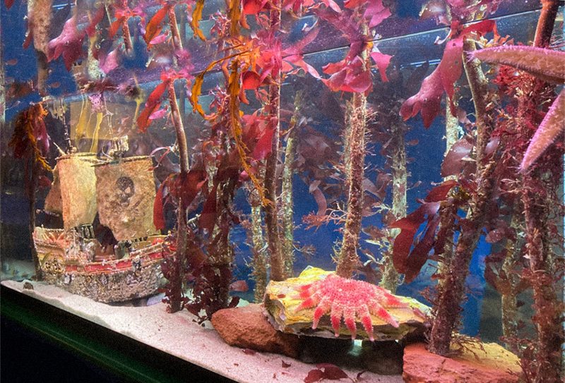 Í fjør varð stórt akvarium uppsett, og har ber til at seta seg í stólin framman fyri gluggan og droyma seg burtur, meðan risa upsar, toskar og kalvar svimja framvið. Nógv ymisk fiskasløg á Landgrunninum, Føroya Banka og øðrum grunnum verða sýnd fram. Harumframt er dentur lagdur á at sýna fram tey mongu ryggleysu djórini, sum eru í sjónum kring oyggjarnar. Høgguslokkurin við teim átta ørmunum og myrki havállurin eru eisini klárir til heystfrítíðina. Smáu tvíbrikkutu stubbarnir liva saman við slangustjørnum, sum spentar fara upp at dansa og gartera, tá tvíbrikkutu stubbarnir fáa at eta.