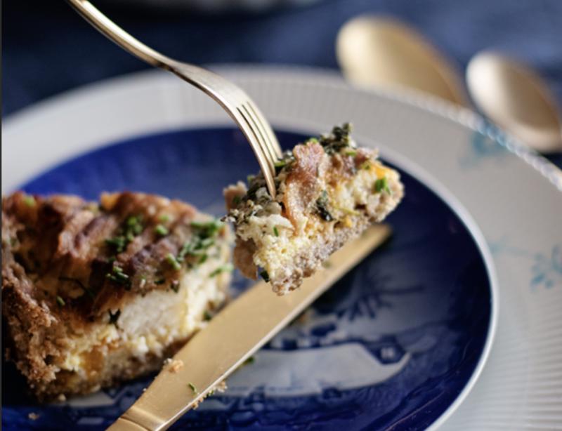 Sker graskerið í smáar bitar, umleið 1 cm. Sker toskin í miðalstór stykki. Blanda egg, róma, salt og pipar. Legg tosk og grasker á tertubotnin og stoyt eggjablandið yvir. Hakka timian og stroy yvir. At enda gert tú eitt lok við beykoni.