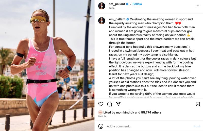 Fyrst í mánaðinum fekk bretska rennistjørnan, Emma Pallant-Browne, menstruatiónin beint áðrenn, hon skuldi til eina grótharða triatlon kapping, og tá myndafólkið hevði fangað myndina, gjørdi hon ikki matari enn at luta myndina á egnum Instagram vanga, har hon greiddi frá um avbjóðingarnar við at vera ein kvinna í kappingar ítrótti.
